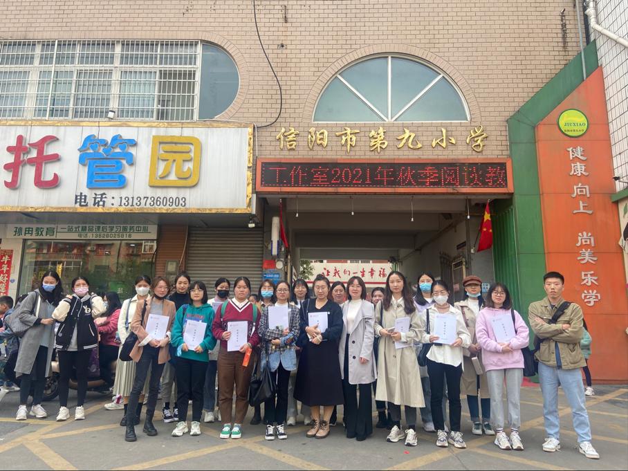 为了提高小学教育硕士研究生的课堂教学技能,学习优秀教师的课堂教学风采,推动理论与实践相结合,10月27-28日,2021级小学教育专业硕士研究生在研究生班主任常燕燕老师的带领下赴信阳市第九小学参加“巧设员工活动 落实语言学用——余映潮工作室暨中原名师周雁翎工作室”2021年秋季阅读教学研讨活动,开展专业教育见习。