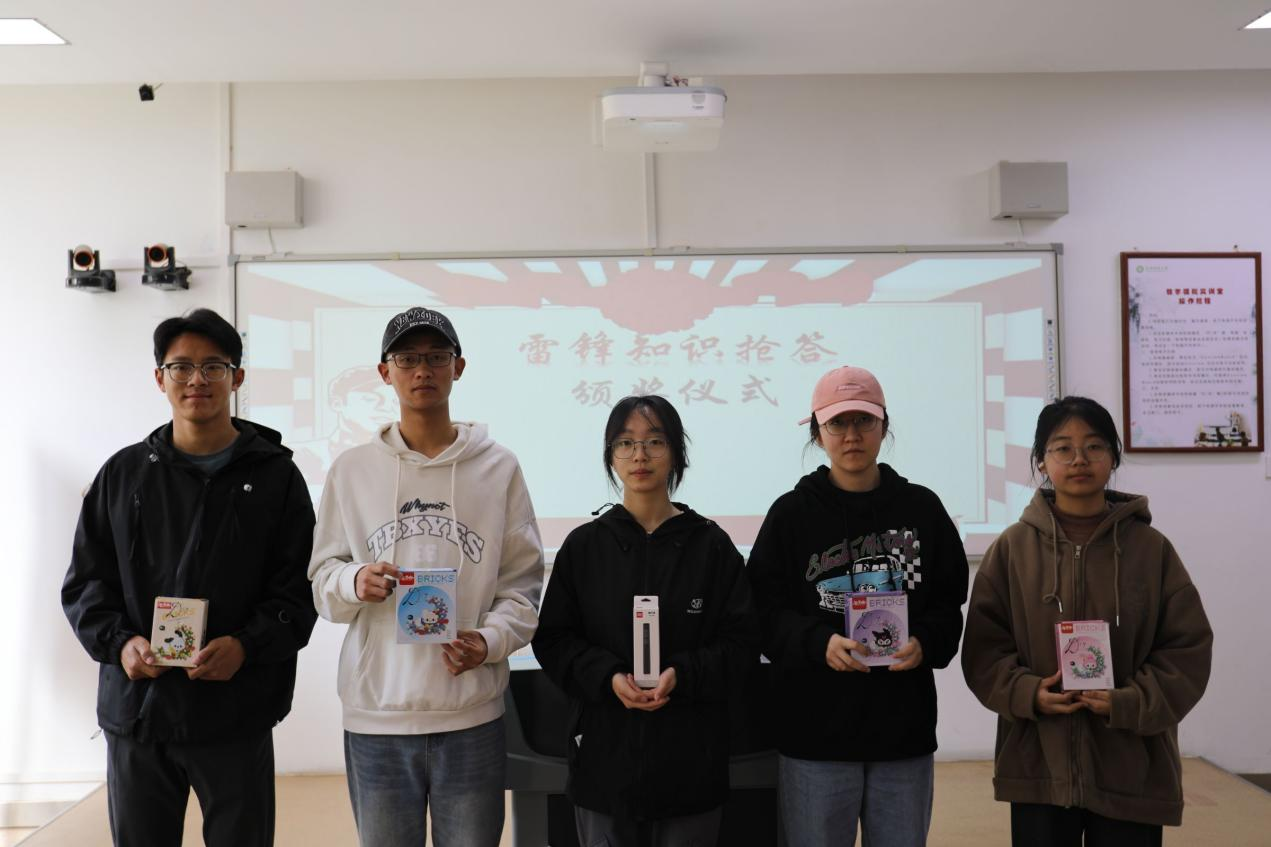在知识抢答赛中,同学们围绕雷锋生平、语录、新时代雷锋精神内涵等展开激烈角逐。经过专业评委评审,选出各比赛获奖同学。活动最后,由韩祎斌为大家发放奖品,全体成员合影留念。