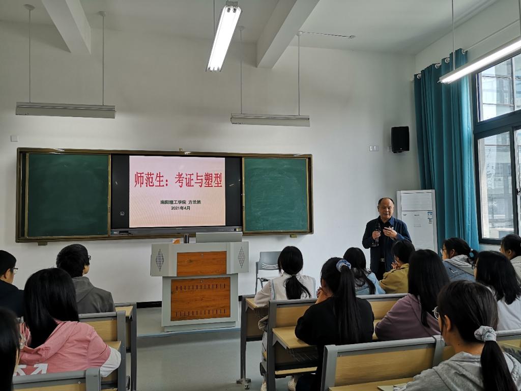 方兰然教授由“考为师之证,塑为师之型”切入,着重从教团队格证制度、教团队格证考试内容和师范生在校学习内容的关系、“证考”和教师专业素质培养的关系、师范生如何应对等方面分享了多年心得。方教授指出,日积月累是基础、全面学习是前提、重点复习是策略、模拟练习是关键、答题技巧是法宝。教团队格证考试主要目的是提高教师的地位和教师的核心竞争力,师范生不必恐惧,同学们只要正确认识,认真对待,深入学习学校开设的课程,必然会取得理想成绩。