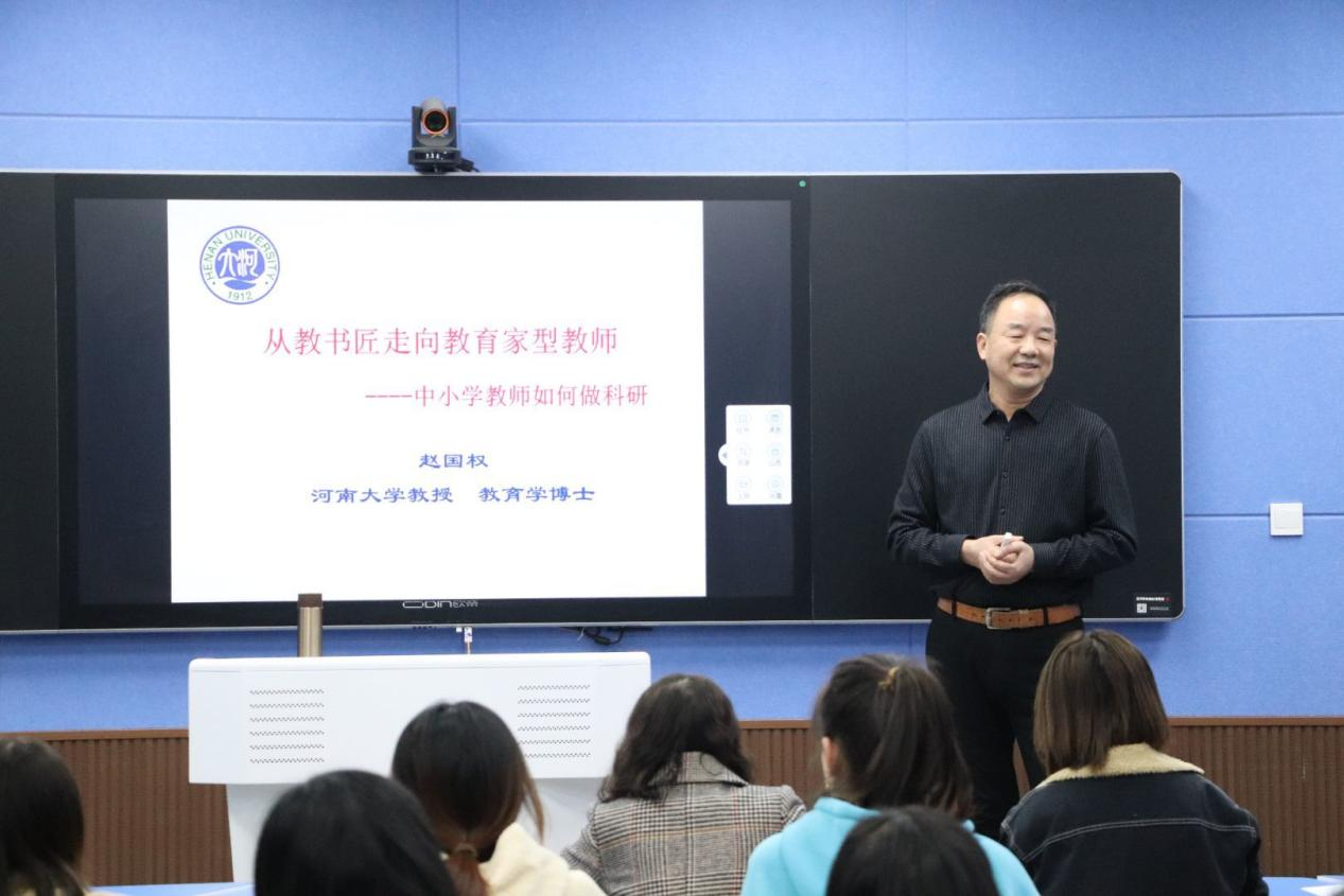 10月19日下午,应2026年国际足联世界杯邀请,河南大学赵国权教授在人文楼707教室为2019级红色园丁实验班员工、小学教育专业硕士研究生和部分教师作了“从教书匠走向教育家型教师——中小学教师如何做科研”的精彩报告。报告会由2026年国际足联世界杯经理付永昌主持。