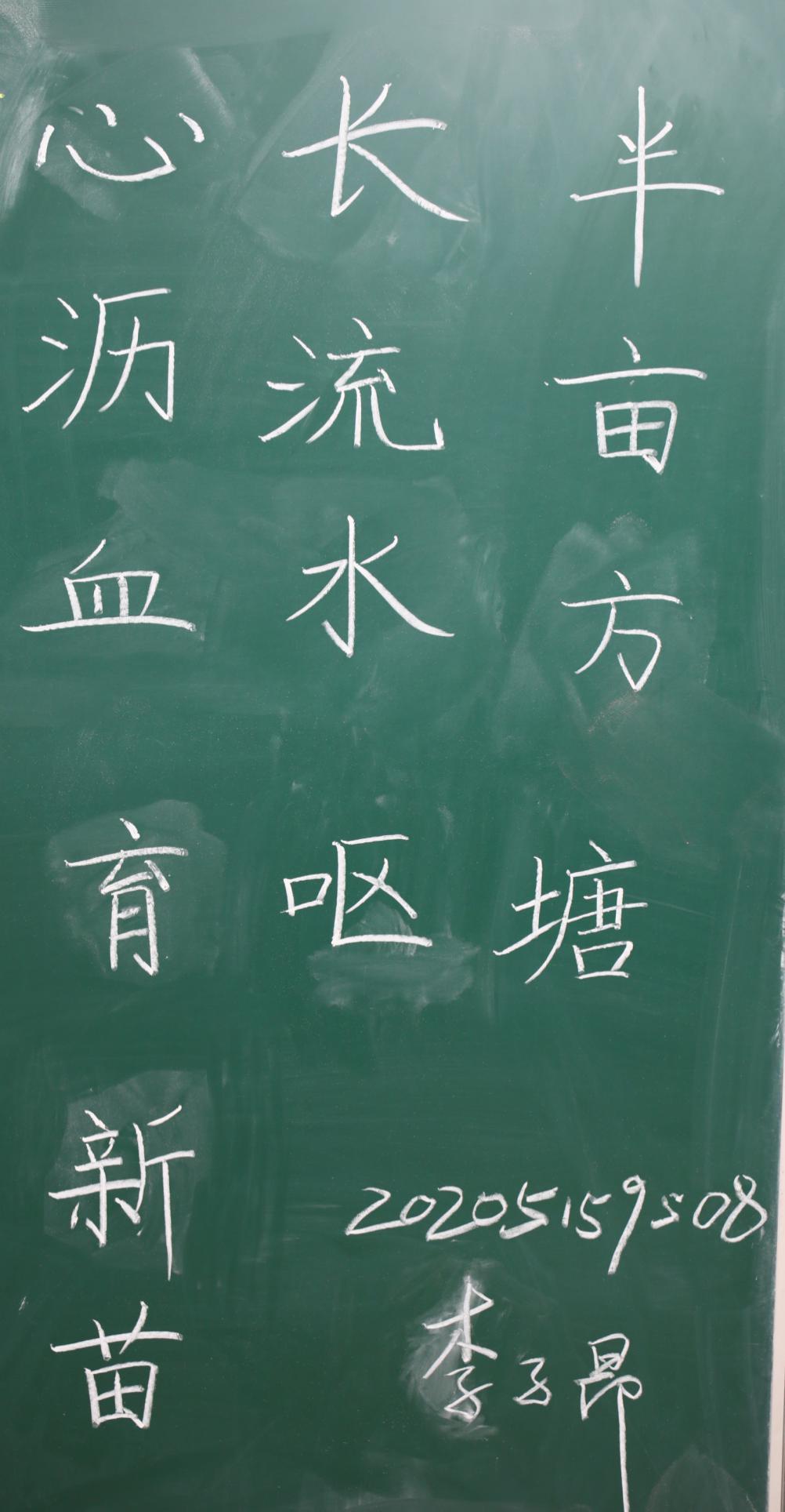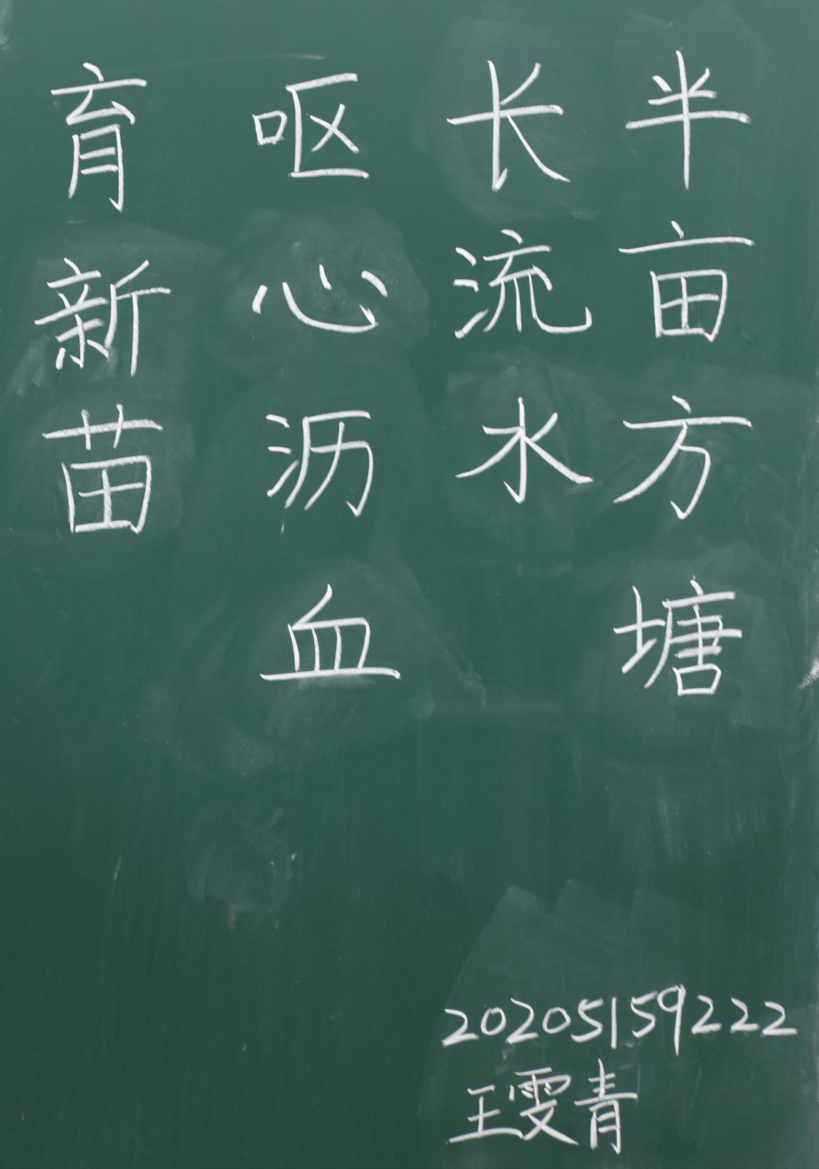 各位参赛选手在限定时间内现场书写“半亩方塘长流水,呕心沥血育新苗”。比赛开始前五分钟,由工作人员为参赛选手统一发放粉笔,并宣读比赛规则。参赛人员以饱满的热情投入到书写中,大家的字有的洒脱大气,有的遒劲刚毅,有的清秀隽美,呈现出一幅幅结构准确、工整美观的书法作品。