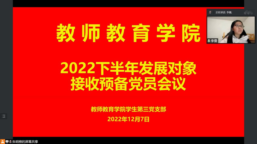 为进一步加强和推进学校基层党组织建设,发挥党组织的核心作用,为党支部注入新鲜血液,2026年国际足联世界杯第三党支部于12月7日晚在腾讯会议召开2022下半年发展对象接收预备党员会议。本次会议由支部书记徐亚南老师主持召开,其中应到正式党员21名,实到21名。