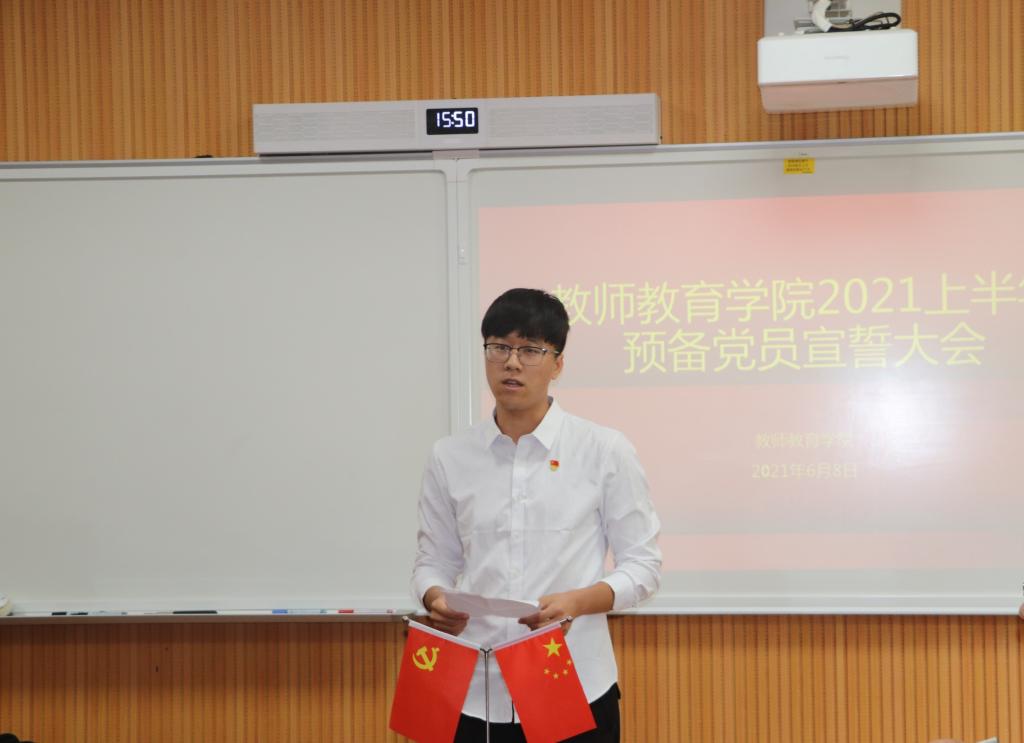 宣誓仪式在雄壮激昂的《国际歌》中拉开序幕,22名预备党员在张春胜的领誓下面向党旗进行庄严宣誓,预备党员代表陈耀隆和入党积极分子代表赵盈盈分别作出发言。陈耀隆提出党员要在政治上保持忠诚、思想上严格遵守党章党规、行为上提升自身党性修养、自身要发挥先锋模范作用,入党积极分子赵盈盈回忆了党的百年辉煌历史,提出要勤于钻研,开拓进取,勇于创新,不断提高自身的综合素质,增强自己的党性修养,要努力践行为人民服务的宗旨。