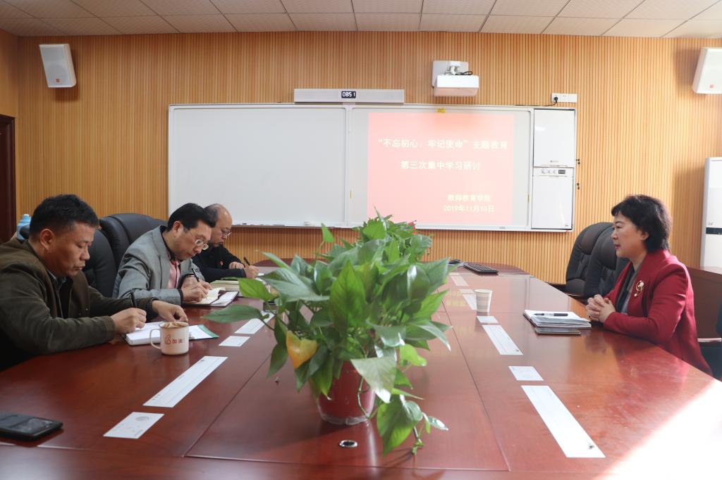 与会人员集中学习研讨党的十九届四中全会精神后,潘登从理论学习的形式、内容、成效、党课开展的情况、调查研究的成果、检视问题的情况、整改落实的措施等方面汇报了学院主题教育工作开展情况;付永昌从小学全科教师专业特色、团队队伍建设等方面汇报了学院的建设发展情况。潘登表示,学院全体师生党员把学习党的十九大精神、十九届四中全会精神、党章党规作为当前首要政治任务,根据“不忘初心、牢记使命”主题教育的要求,开展了丰富多样的学习形式,并结合工作实际,认真开展调研活动,总结了学院关于基层党组织建设、人才引进团队队伍建设、教师教育实训中心建设、科级干部队伍建设、团学等方面的工作,不断完善制度体系,加强整改落实,确保各项工作在主题教育活动的推动下积极开展、落细落实、取得实效。