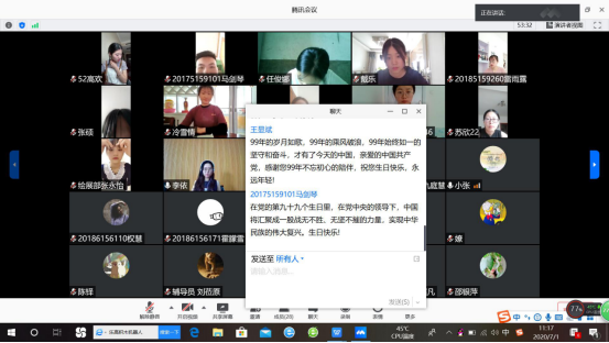 会议伊始,与会党员在仇庭慧的领誓下重温了入党誓词。接着,员工党员集中学习了疫情期间以钟南山院士和李兰娟院士为代表的感人事迹及伟大精神,与会成员纷纷表示,将会认真学习两位院士为国为民、无私贡献的高尚品质,树立正确的人生观、价值观。其中,18级专科一班入党积极分子防疫控疫先锋代表陈铎讲述了自己在疫情蔓延时期经过严格防护培训和考核,加入社区志愿者服务队的所做所感,他认为,在志愿者服务队为战役的初步胜利贡献一份青春力量是极其光荣的,员工党员应该不忘初心,牢记使命,发挥先锋模范带头作用。在“我想对党说句话”暖心时刻,全体党员都表达了对共产党生日的祝福和实现中华民族伟大复兴的美好祝愿。