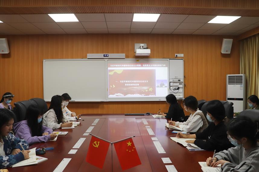 全体成员共同观看由胡敏先生主讲的《习近平新时代中国特色社会主义思想:马克思主义中国化的飞跃》一课。胡敏先生从习近平新时代中国特色社会主义思想的鲜明品格、新时代历史性成就历史性变革的时间结晶、牢固树立党的最新创新理论的指导地位三个方面出发,详细地介绍了十九届六中全会提出的“十个明确”、新时代历史性的“十三大成就”以及如何深刻把握新时代共产党人的历史使命。他讲到,作为党员发展对象,同学们要熟知新时代的成就,学习习近平新时代中国特色社会主义思想,对党忠诚,将个人理想与国家前途命运联系起来,有责任有担当。学员纷纷表示,要在本次培训中认真学习、努力实践,紧扣新时代新任务新要求,跟上新时代前进的步伐,用习近平新时代中国特色社会主义思想武装头脑,做到“学思用”贯通,不断自我修炼,脚踏新征程,建功新时代,做有担当的新时代青年。活动最后,全体成员在党旗下合影留念。