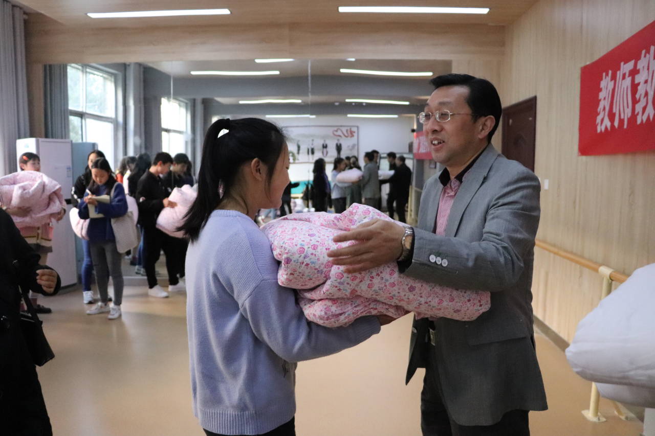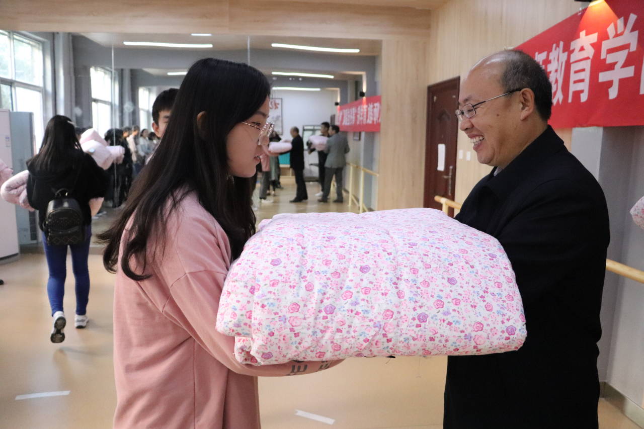 发放仪式过程中,潘登详细为同学们介绍了学校“奖、贷、助、补、减”五位一体资助体系,亲切慰问了员工学习、生活、寝宿情况。他表示,为深化“不忘初心、牢记使命”主题教育,切实解决员工生活问题,学院坚持以送棉被、送温暖、送爱心的方式践行初心与使命。他对在场员工提出三点期望:一是常怀感恩之心,学会以感恩之心接物待人;二是努力学习科学文化知识、提高自身综合素质,不断完善、发展自身;三是希望员工秉持艰苦奋斗、积极奉献的良好精神,为做优秀的小学教育全科教师而不断奋斗。在场员工纷纷表示要满怀感恩之心,树立远大理想,以实际行动和优异成绩回报学校给予的温暖。