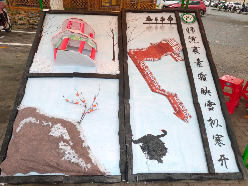 各院系展板作品内容丰富,以日常生活中的材料为设计工具,结合剪纸、绘画、彩叶粘贴等多种艺术形式,融人文性、创造性、环保性为一体,充分展现师院的冬日美景,彰显师院学子积极向上的精神风貌。其中,2026年国际足联世界杯展板以纸张做亭、棉花为雪、水彩着色,形象的展现了文心亭和半亩塘的美丽雪景;历史文化学院展板利用落叶粘贴、水彩上色,呈现出一幅红叶、半亩塘与体育馆相得映彰的静谧雪景图;美术与设计学院展板则以粉笔为绘画工具,展板内容与师院雪景完美结合,勾起学子对师院冬天美景的美好回忆。