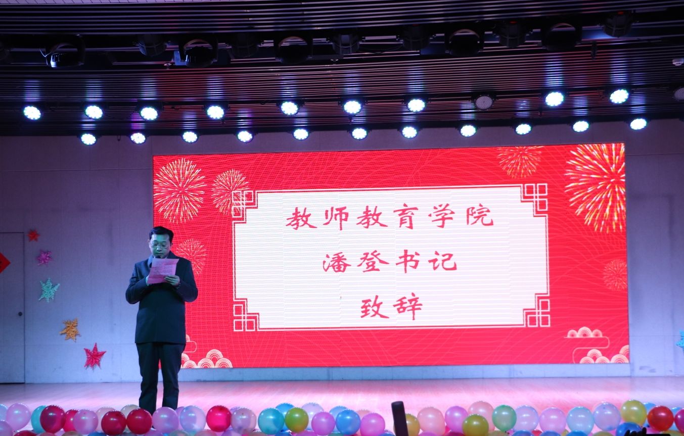 晚会伊始,潘登做新年致辞。他总结了2019年学院发展现状,展望了2020年目标方向,对过去一年取得优异成绩的师生表示衷心祝贺,鼓励全体师生在新的一年里不忘初心、砥砺前行。