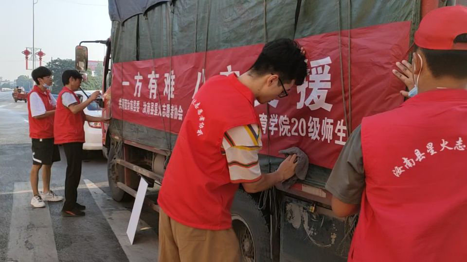 7月28日下午,爱心募捐结束后,20级本科六班团支书吴华政与其家乡所在地汝南县团委积极沟通,县团委对此表示强烈支持,随即与其下辖的星火志愿服务队对接并捐出5000元与小教学子一同驰援河南新乡。7月29日,接到河南新乡红十字会反馈,由于集中安置点灾民缺乏米面油等物资,生活质量和医疗物资都无法保障,决定购买170袋面粉,120桶油和7箱医疗物品。7月30日,学院员工代表吴华政,康思源跟随星火志愿服务队的物资车队一同前往河南新乡搬运救援物资,慰问救灾人民。返回时,新乡人民对其表示由衷的感谢。