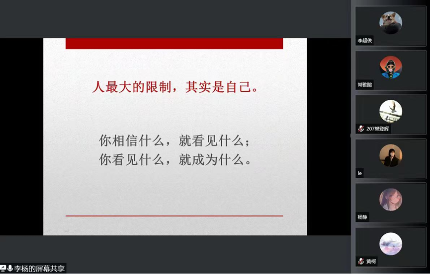 李杨以“摆正心态指针,开启积极人生”为题,结合自身生活实践经历,从正视心态、了解心态、转变消极心态、解锁成功心态四个方面进行了分享,多维度深挖每个板块核心内容。李杨向同学们介绍了四组心态模式:固定型心态与成长型心态;封闭型心态与开放型心态;防御型心态与进取型形态;内向型心态与外向型心态。通过情景假设,名著论述的方式,用幽默风趣的语言,带领同学们感受到几种心态的不同,认识到积极心态和消极心态所带来的不同影响。她认为,心态就像一只看不见、摸不着的船舵,正在无意识地控制着我们人生的方向,塑造着我们生活的方方面面。希望同学们把控好心态的船舵,更积极地面对工作和生活。分享最后,同学们纷纷展开交流,李清政谈到,人生最大的发现就是发现自己,要了解自己的内心,让自己的人生快乐起来,她以自己为例,在书中内容的指引下,对自己原本的内向型性格做出了改变,收获了成长的喜悦。徐亚南老师则针对近期在校同学们微博话题出现的不良情绪,呼吁大家要保持良好心态,理智应对。