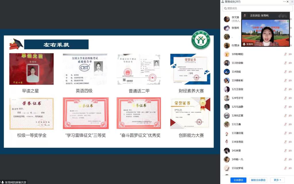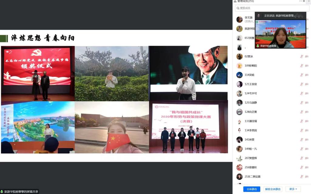 国际教育学院国家奖学金获得者张雪柯、文学院校园明星获得者叶璐怡、旅游学院自强之星获得者杨擎擎依次向同学们讲述了她们的青春故事。张雪柯通过讲述四个“选择所热爱,热爱所选择”的故事,成长遇到挫折时,乐观面对,学习的路上,奋勇向前。鼓励同学们要矢志不渝地坚持每一个选择与每一份热爱;叶璐怡用信仰之卷、担当之卷、实践之卷、自强之卷,分享了自己奋斗的青春,她以“路长不及心远,天阔不过眼高”激励自己一路前行,呼吁同学们要以昂扬且谦卑的姿态去自信生长;杨擎擎围绕“筑梦新时代,青春谱华章”,分享了自己多彩的校园生活和未来目标,她怀揣热血和梦想,在自强的路上坚定前行,成为自己的一束光。