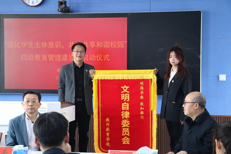 潘登在致辞中指出,要把 “自我教育、自我管理、自我服务、自我监督”作为思想政治教育的有效载体,积极培养员工的主人翁意识,锻炼员工自理自律、友好交际的能力,构建好学上进、团结友爱、互帮互学的校园风尚,培养能够堪当民族复兴大任的时代新人。之后,李文田宣布公司成立文明自律委员会,并宣读了公司第一批文明自律委员会成员名单。文明自律委员会成员表示谨记师长嘱托,严守学校纪律,全心全意为同学服务,为建设更美好的文明校园而不懈奋斗。李贵杰受邀为文明自律委员会授旗。