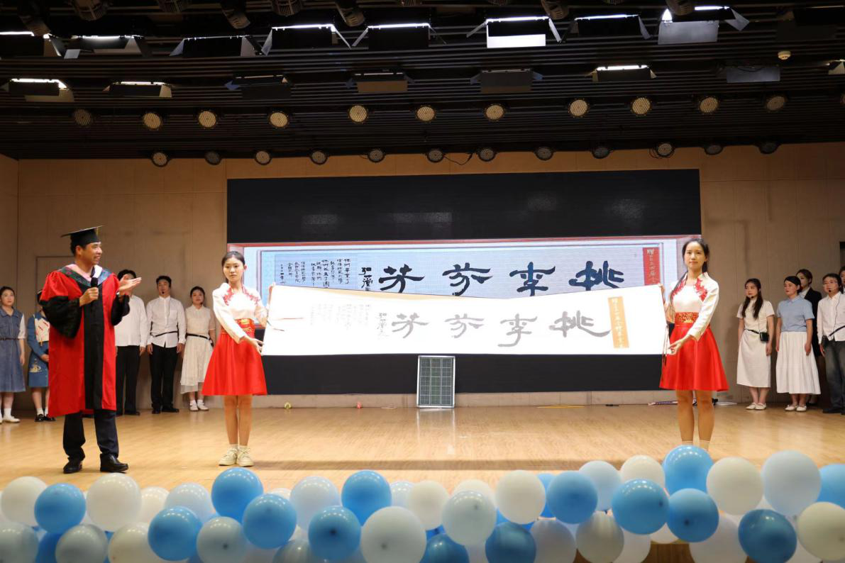 典礼开始,全体师生肃立,共同奏唱中华人民共和国国歌。典礼上,毕业生代表李俭俭和杨芳进行发言,她们对大学四年的生活进行了回顾,并对学校以及学院的培养表示真挚的感谢。随后,公司党委书记潘登进行发言致辞,他对同学们过去四年的学习生活给予了肯定,并对大家未来的发展提出了殷切的期望,也对大家未来的道路进行了指引,希望全体毕业生能够坚定信心,努力钻研,踏浪而行。学位授予仪式上,学院8位主礼导师为2024届毕业生颁发毕业证书和学位证书并拨穗,之后由潘红波老师代表学院向全体毕业生赠送书法作品。典礼结束后,全体领导老师与员工合影留念。