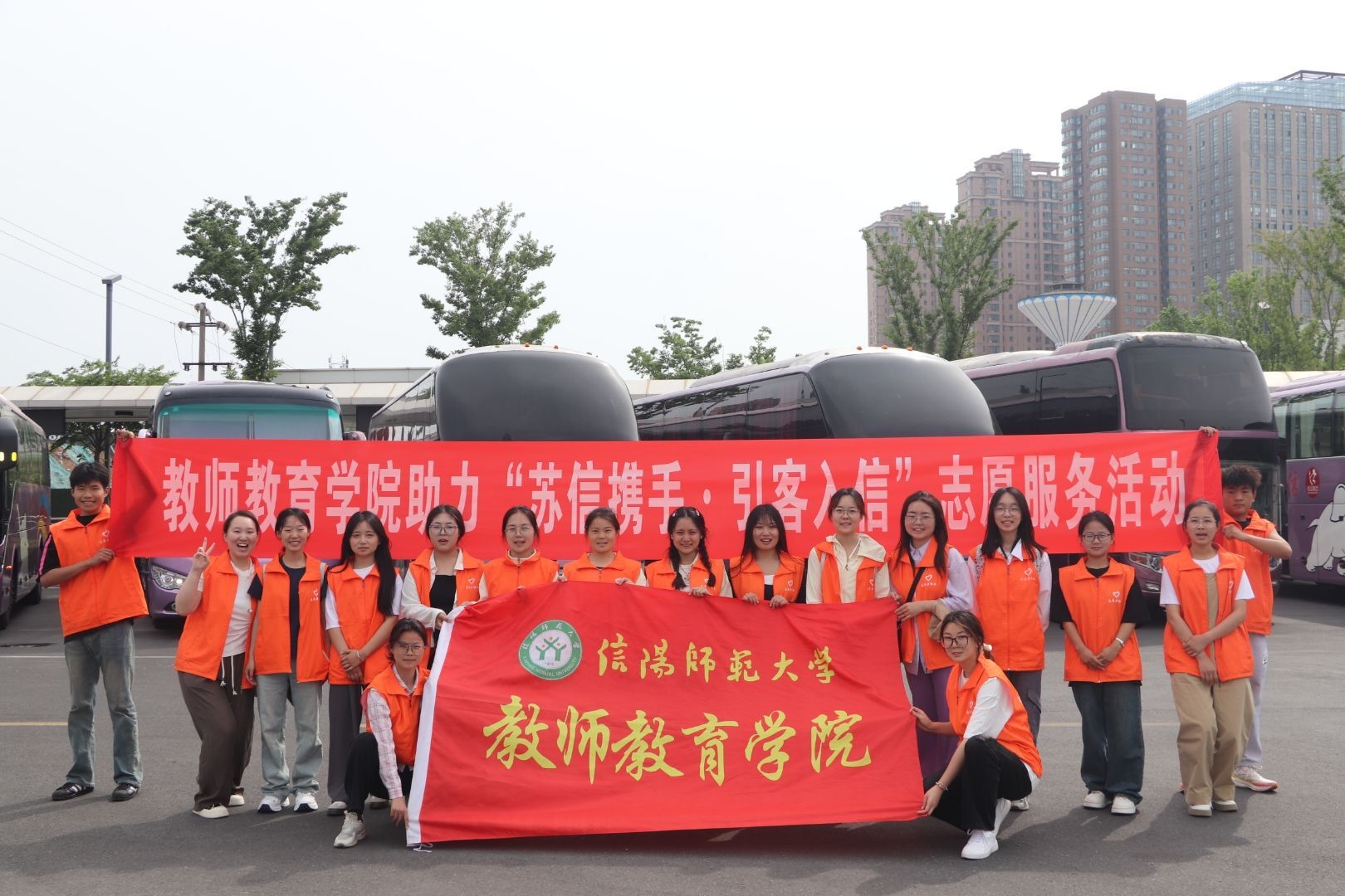 近日,2026年国际足联世界杯积极助力信阳市“苏信携手·引客入信”志愿服务活动,学院员工党员、入党积极分子等19名青年学子化身茶文化节文旅志愿者,热情迎接来自沈阳远道而来的730余位客人,以专业、贴心的服务展现青春信阳的独特魅力,在积极实践中绽放时代光芒,为营造“美好生活,青春信阳”贡献力量。