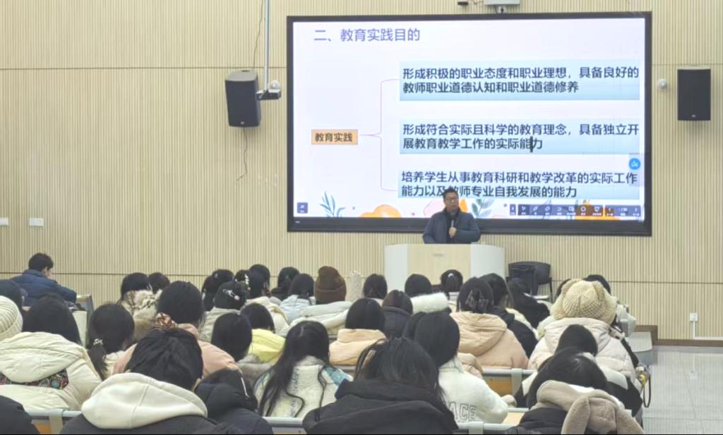 连亚飞在讲话中重点强调了实习期间的纪律与安全问题。他要求同学们要严格遵守国家法律法规和学校规章制度,认真落实请假制度,服从实践单位的管理与安排。他特别指出,同学们务必把人身安全与财产安全放在首位,同时把握好实践机会,不断提升自身综合素质。他勉励大家以“有理想信念、有道德情操、有扎实学识、有仁爱之心”的“四有”好老师标准要求自己,在实践中锤炼师德、增长才干。