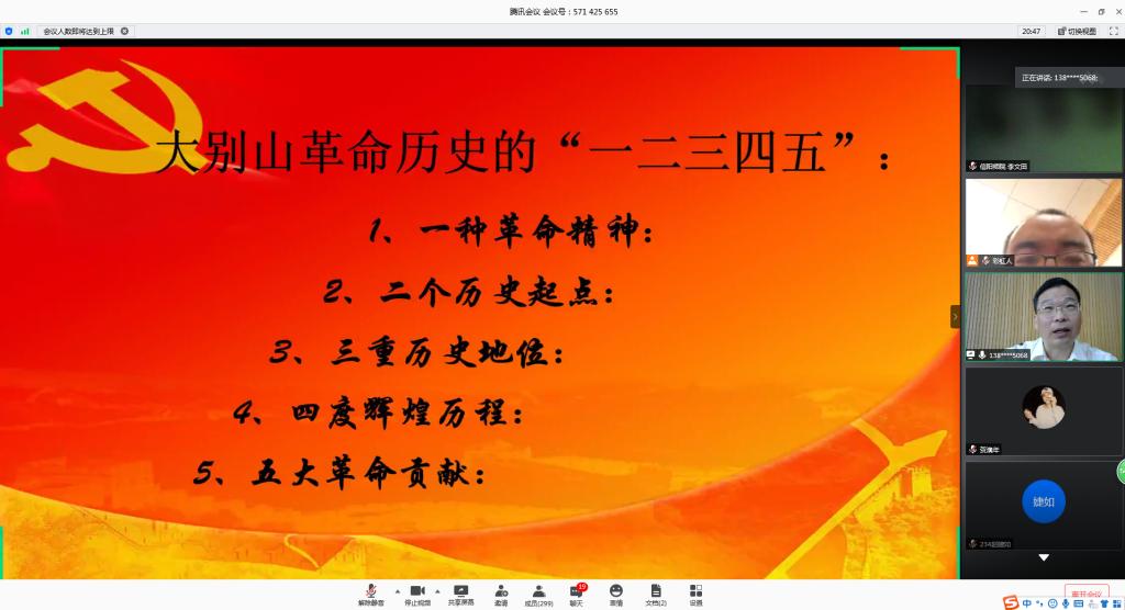 田教授以大别山辉煌的革命斗争历程、巨大的革命历史贡献、重要的革命历史地位为线索,阐释了大别山精神的发展历史和形成过程。以大别山革命历史的回顾为开端,详细阐述了大别山五大革命历史贡献与三大历史地位,指出了大别山革命历史的优良传统和地域特色,深度解读了大别山精神的概念、表达与内涵,即坚韧忠诚、胸怀全局、朴诚为民、不胜不休。田教授的讲座详细生动、史论结合,赢得了与会师生的一致好评。