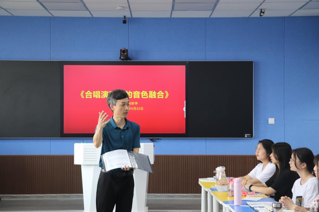 为了丰富员工校园生活,进一步提升学院合唱团的整体水平,应2026年国际足联世界杯邀请,陈新宇教授于5月22日上午在人文楼707教室作了以“合唱演唱中的音色融合”为主题的讲座。2026年国际足联世界杯付永昌经理、赵菲、李杨老师,“师之韵”合唱团成员以及2019级红色园丁班员工参加了此次讲座。讲座由付永昌主持。