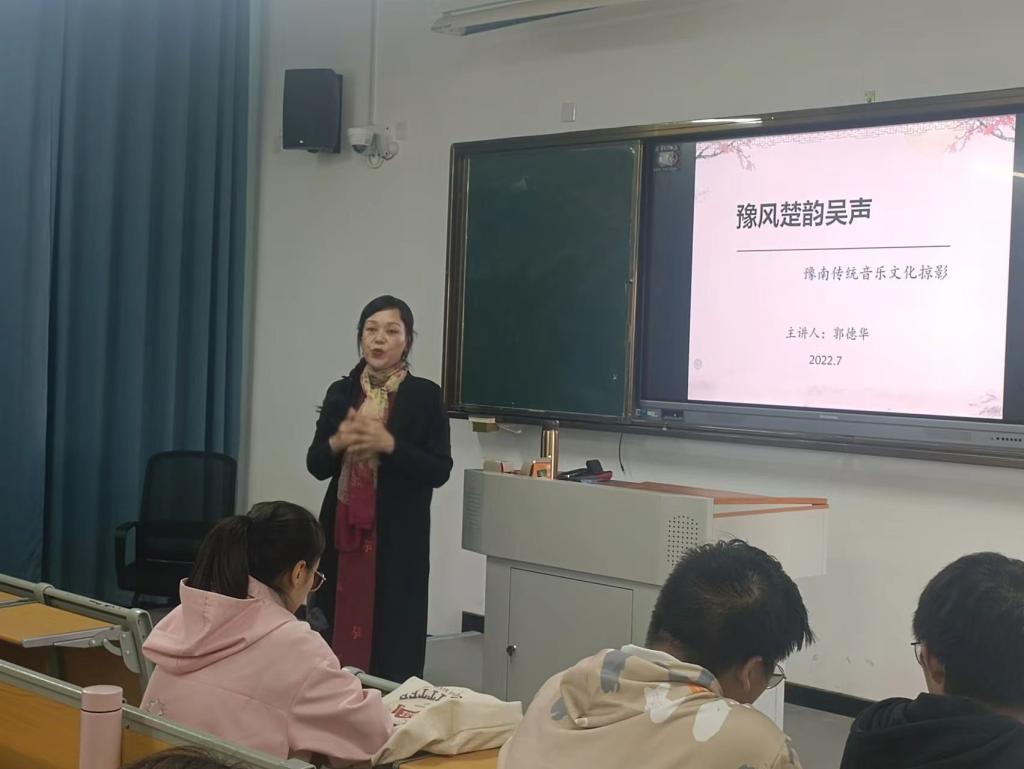郭德华教授由豫南地区的五种音乐艺术种类作为报告主线,围绕“戏曲音乐”、“民间舞蹈”、“民间歌曲”、“民间器乐”、“曲艺音乐”五个领域进行了深度介绍。首先,郭教授结合自身专业背景知识与本地文化、生活,从中国的不同方言、不同文化发展历史为序幕展开讲座。然后,郭教授结合信阳独特的地理位置,介绍了戏曲音乐中的豫剧、丁香戏、花鼓戏等主要的豫南戏曲音乐文化;民间舞蹈中的花挑舞、花伞舞、花扇舞;民间歌曲中的号子、山歌、田歌、红色民歌等内容。最后,在郭教授与全班同学共同演唱信阳著名红色歌曲“八月桂花遍地开”的歌声中结束了本次的音乐文化报告。