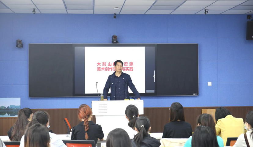 邹教授从大别山红色资源的当代价值、大别山红色资源美术创作的当代意义、大别山红色资源美术创作思考、大别山红色资源美术创作实践四个方面进行了翔实阐释。在实践方面,邹教授结合大别山红色文化作品的创作过程,指出创作时要注意史料、图片、实景素材的收集,选择恰当的表现形式,确定立意,组织画面呈现作品。他谈到,我们今天交流红色美术创作,既是回望过往的奋斗史,也是眺望前方的奋进路。同时,他引导同学们赓续红色基因,用画笔描绘历史,用情感温暖时代。