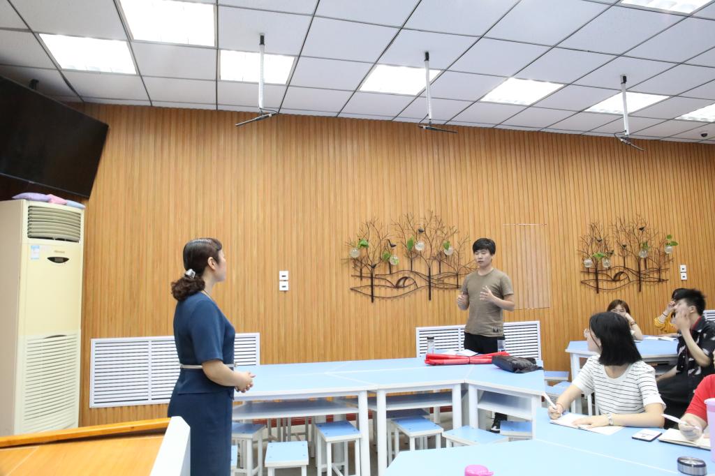 14:20,师生再次集中乘车前往五小。14:50—17:10,于董事长组织师生在五小多功能教室观摩小学阅读课堂教学、小学写作课堂教学活动。15:00-15:40,在小学阅读课堂教学中,老师根据员工实际和《青蛙卖泥塘》课题的特点,科学设计教学过程,很好地落实了精讲、精炼、精点拨的高效课堂教学模式。